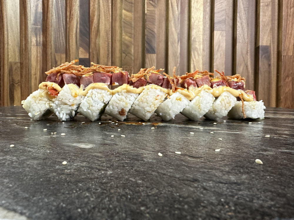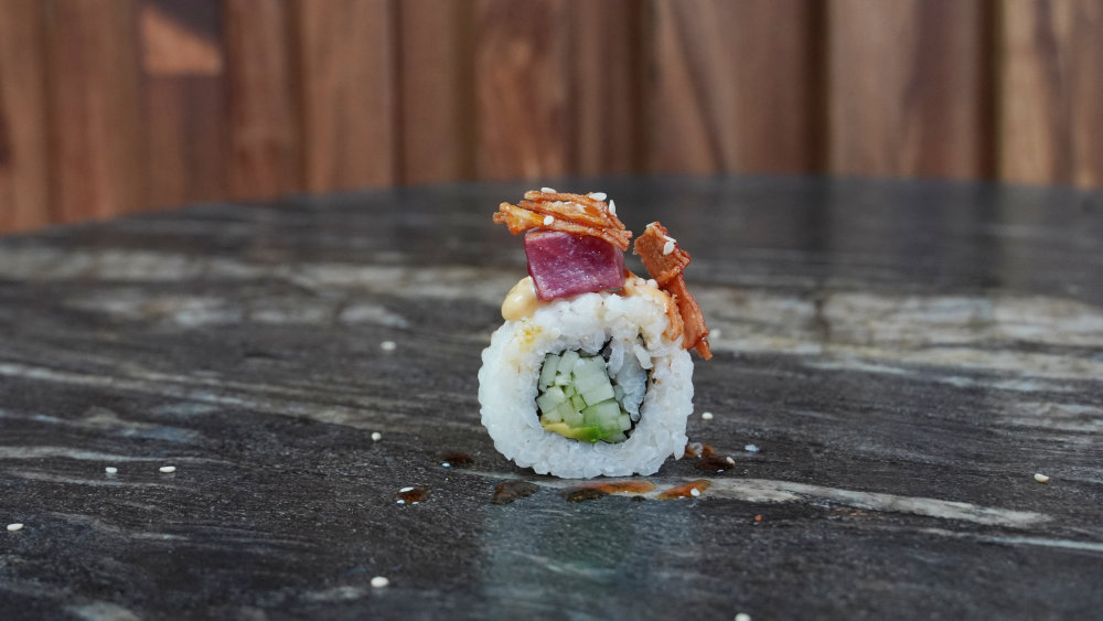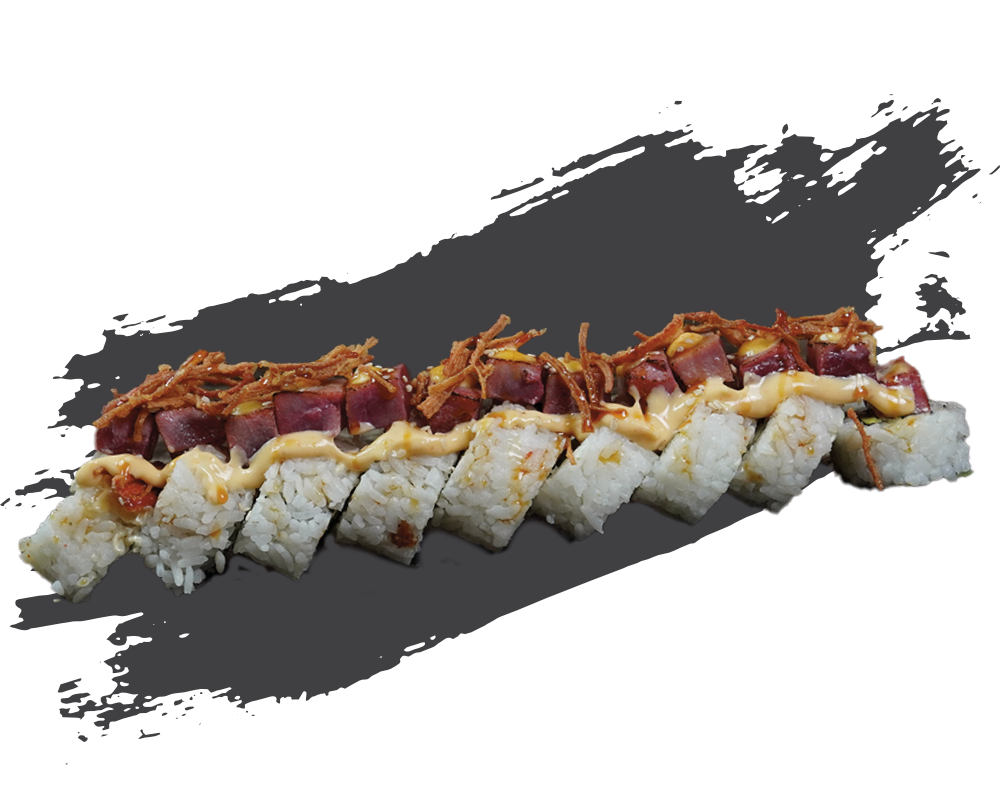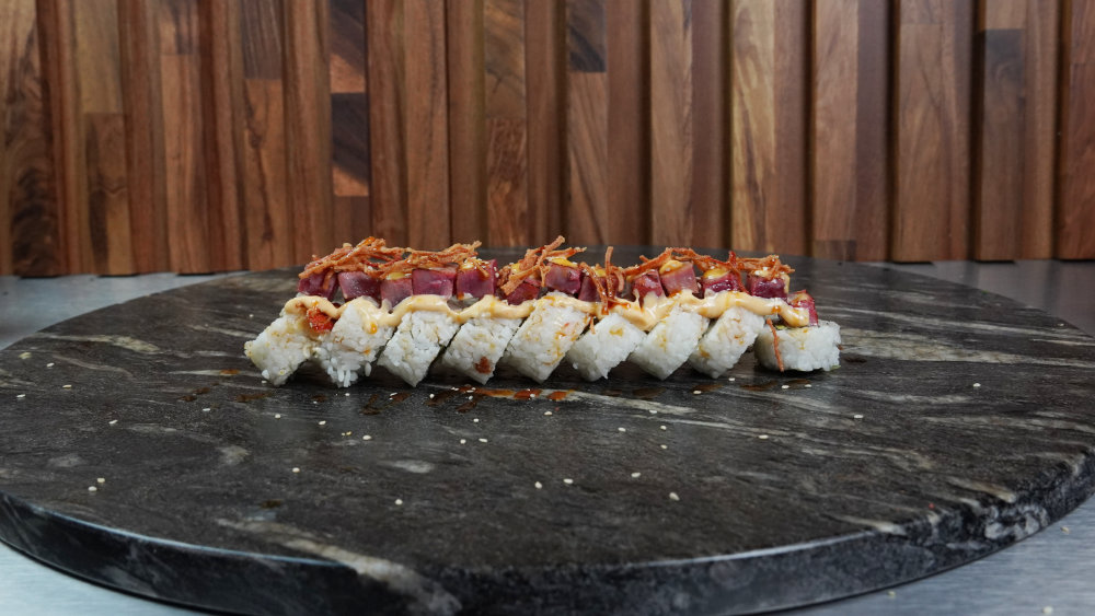 Intenso: pepino y aguacate por dentro, atún spicy por fuera y cangrejo capeado coronando, todo bañado en salsa de anguila.