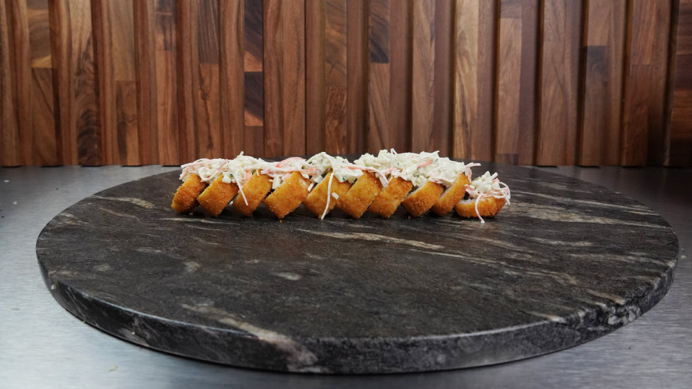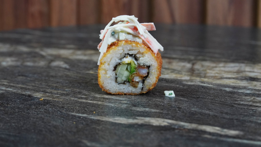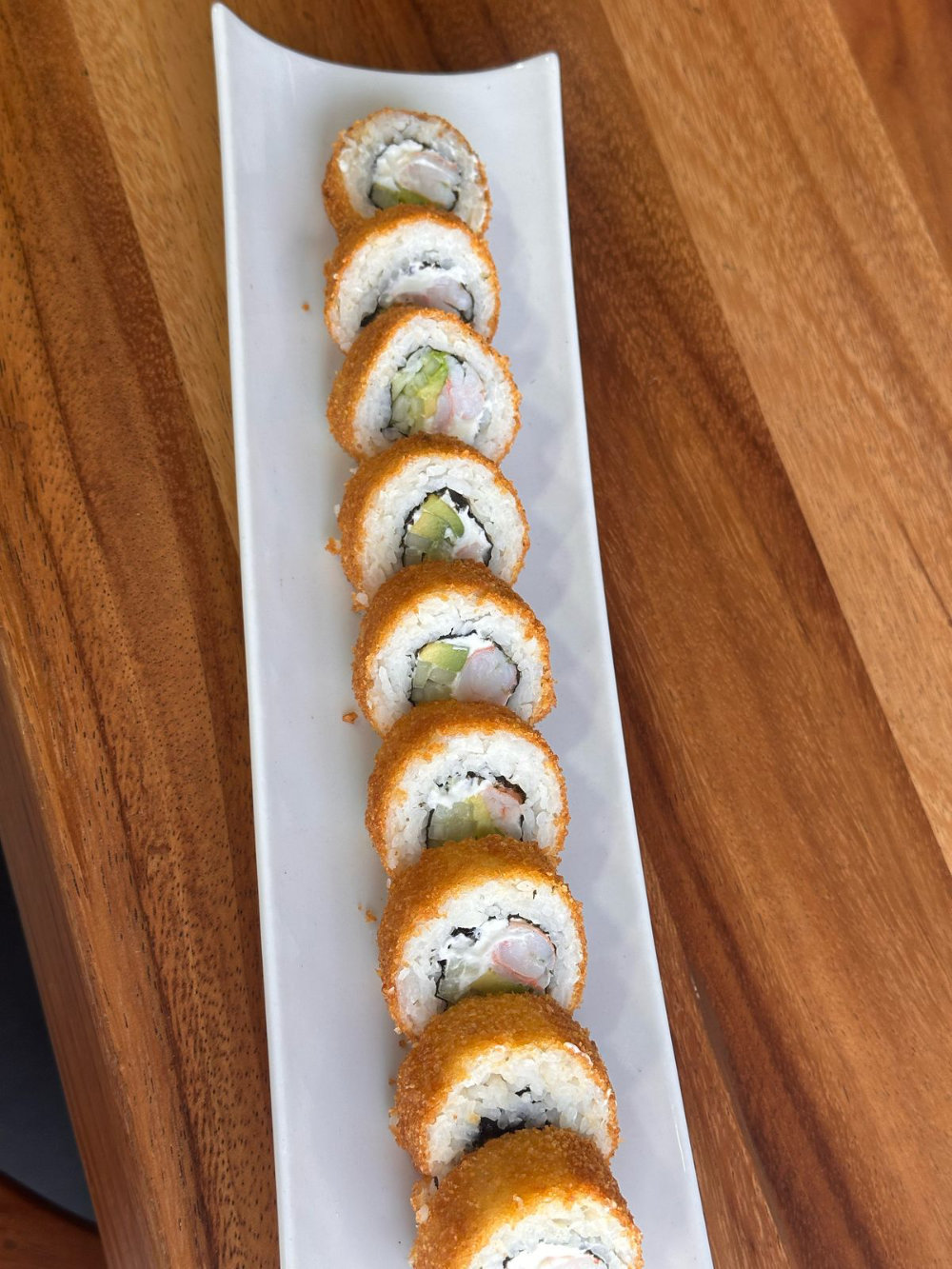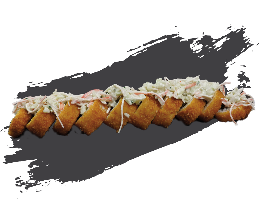Camarón empanizado, pepino, aguacate y queso philadelphia por dentro, empanizado por fuera y coronado con ensalada de cangrejo. Crujiente, cremoso y poderoso. Un roll que entra con todo.