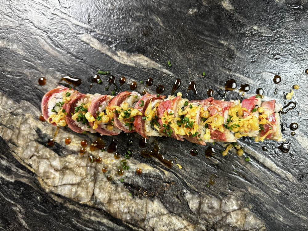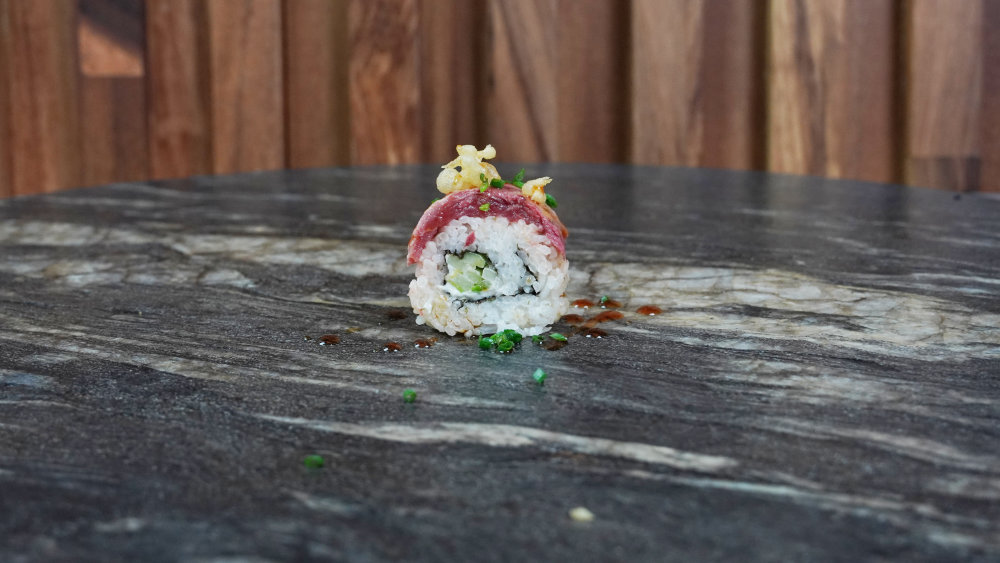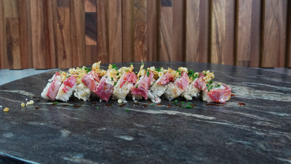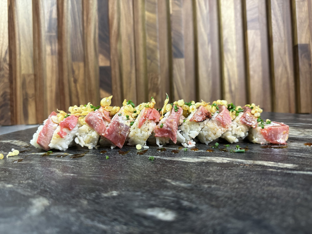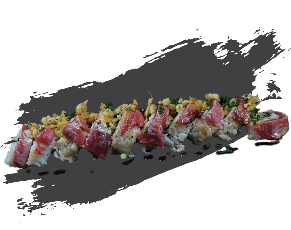 Atún spicy flameado, aderezo spicy, pepino, aguacate, arroz, burbujas tempura, salsa de anguila, philadelphia y cebollín. Una explosión de atún caliente y cremosidad fría. Texturas que chocan, sabores que se elevan. Puro poder flameado.