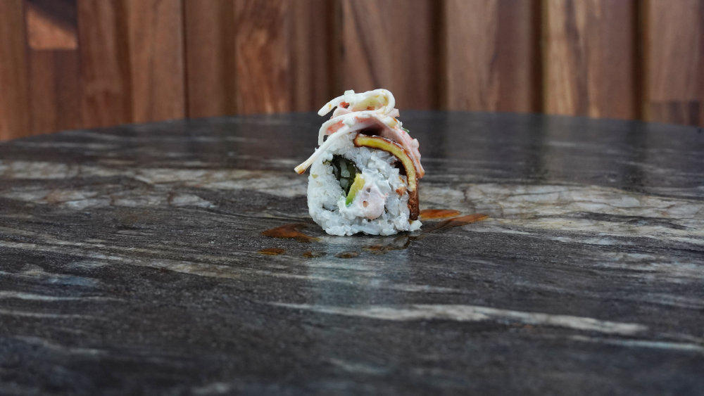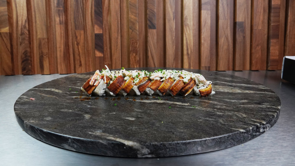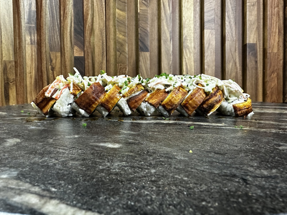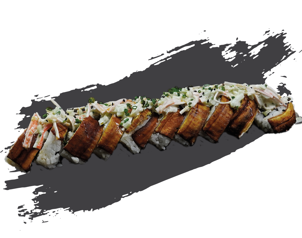Camarón, pepino, aguacate y queso philadelphia por dentro, envuelto en plátano macho frito por fuera, coronado con ensalada de cangrejo y bañado en salsa de anguila. Dulce, crujiente y poderoso. Un roll con carácter.