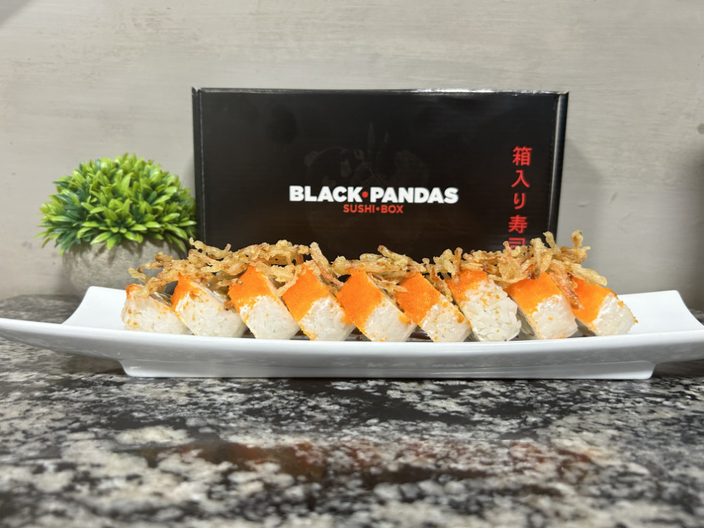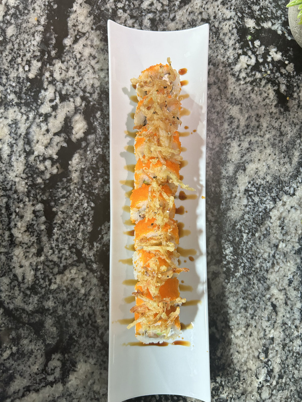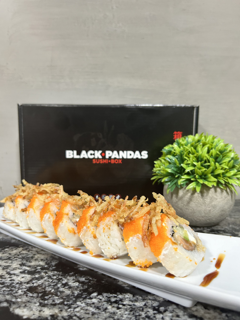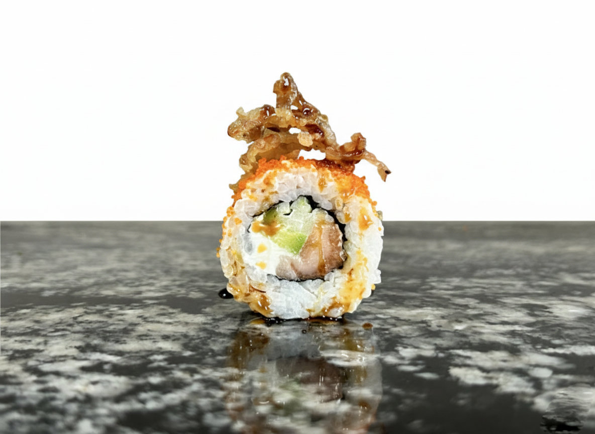 Una explosión de sabor: salmón, pepino, aguacate y Philadelphia por dentro, masago y cangrejo capeado por fuera, terminado con salsa de anguila.