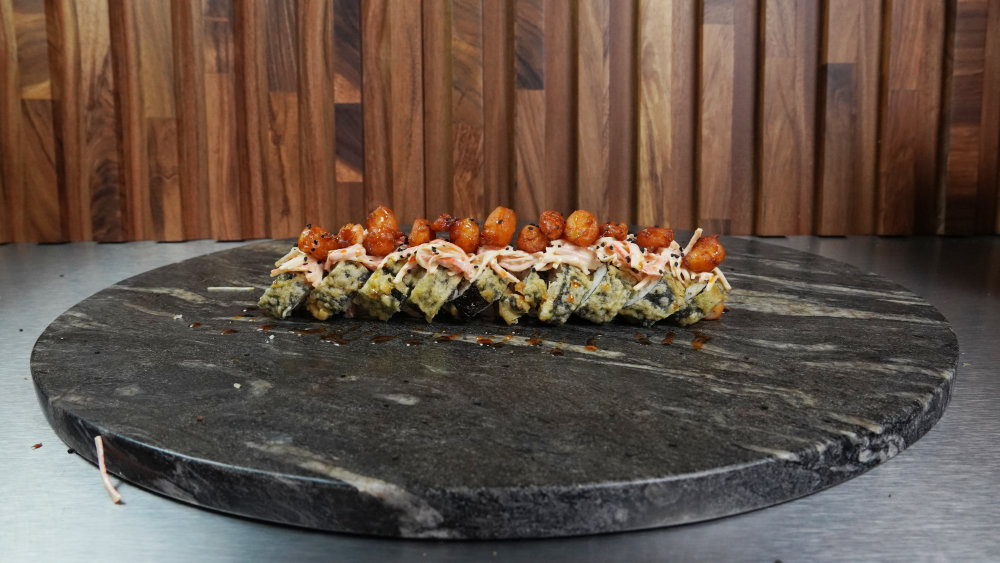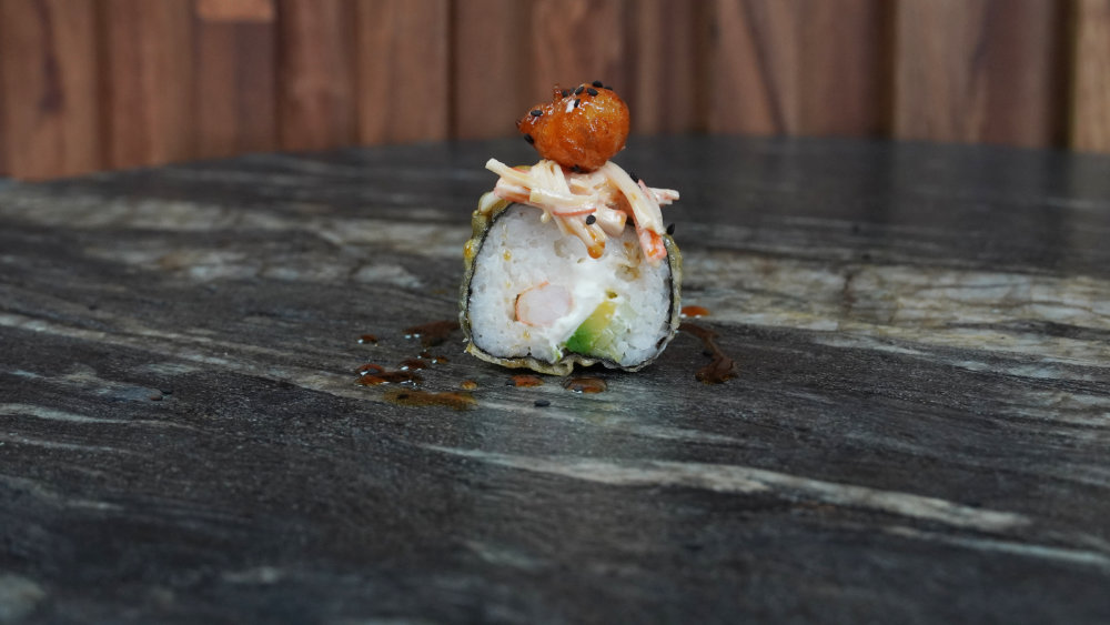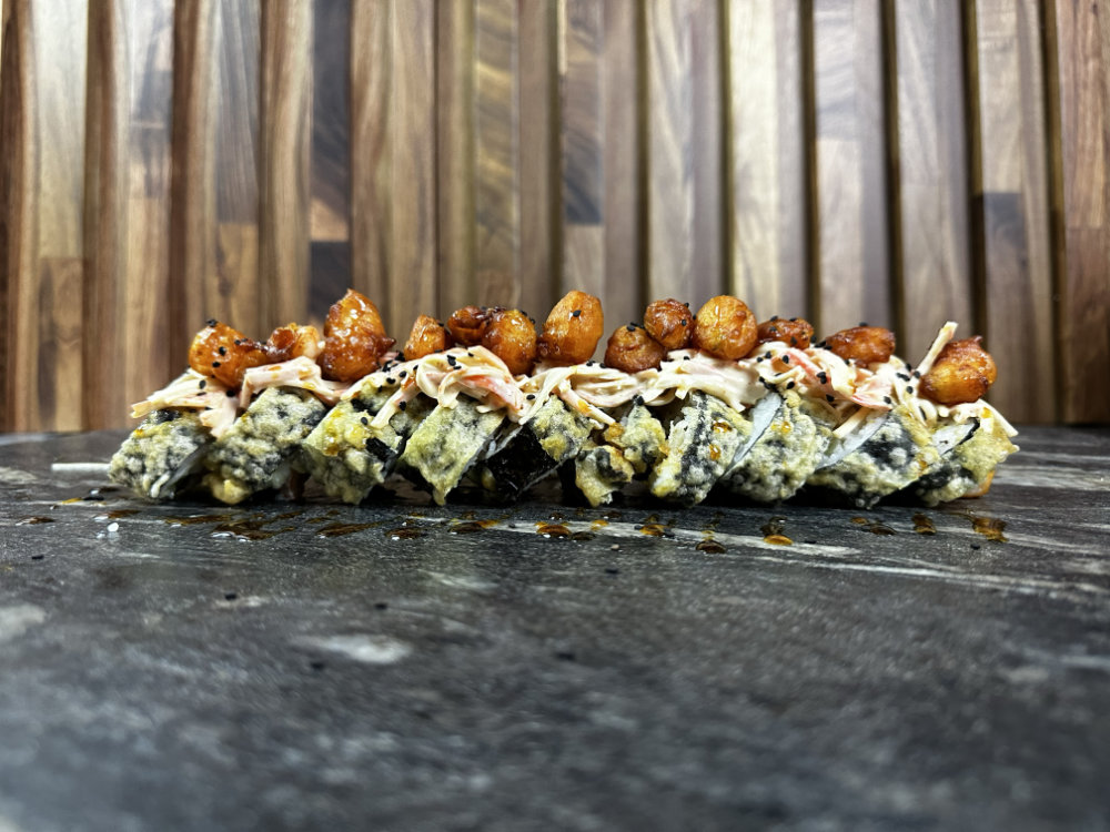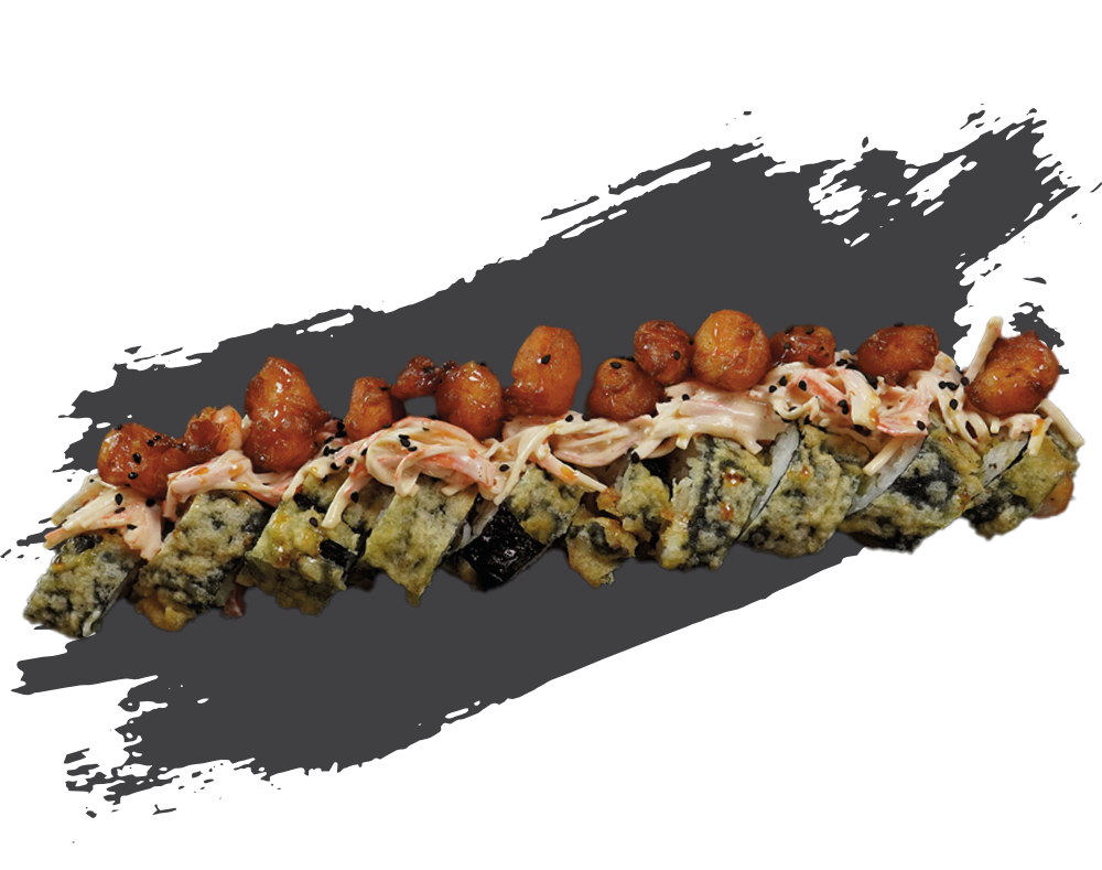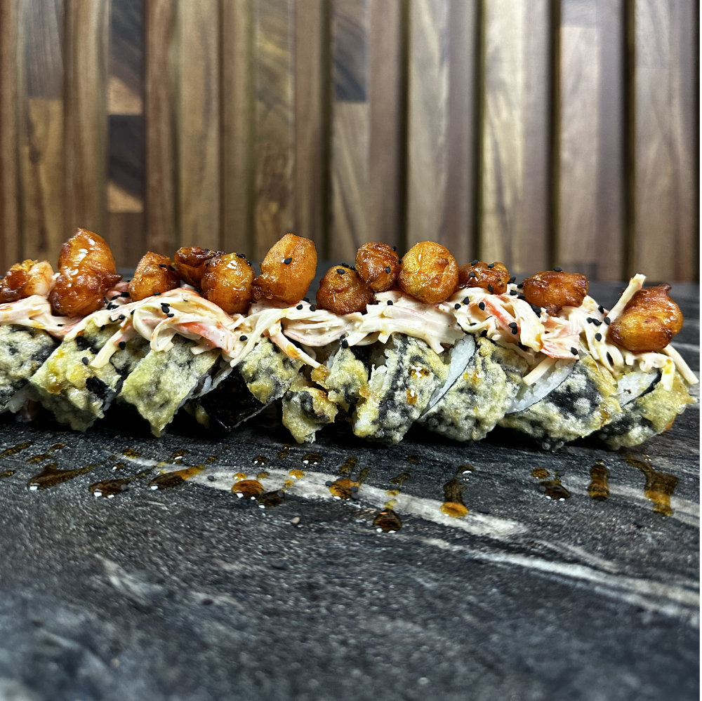 Camarón, pepino, aguacate y philadelphia por dentro; alga por fuera y capeado, coronado con cangrejo spicy y camarones roka. Capeado al punto, cremoso por dentro y con un remate spicy que lo vuelve inolvidable. Un roll con carácter.
